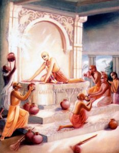 Śrī Gaurasundar primero recogió grandes pilas de toda esa arena, paja, polvo, etc. que se había acumulado por muchos días, y luego, después de limpiar cada área dentro del Templo una segunda vez con escobas y agua, empezó a restregar el Templo y el altar del Señor con la ropa seca que Él vestía, de manera que no quedara una mancha sutil en alguna parte.