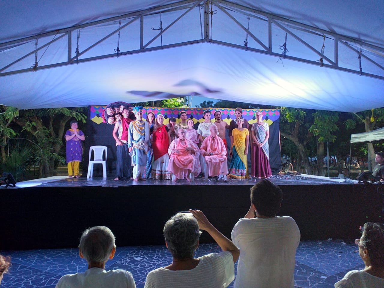 Srila Janardan Maharaja dirigiendo el kirtan de esta mañana, en el dia 8 del Campamento Vaisnava y segundo día del Festival de Harinam.