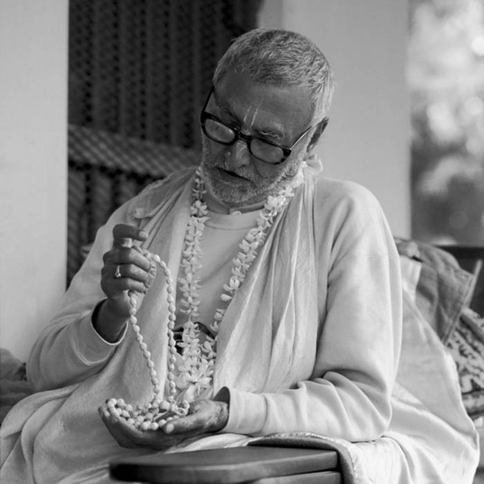 Srila Sridhar Maharaj cantando el santo nombre en cuentas de japa.