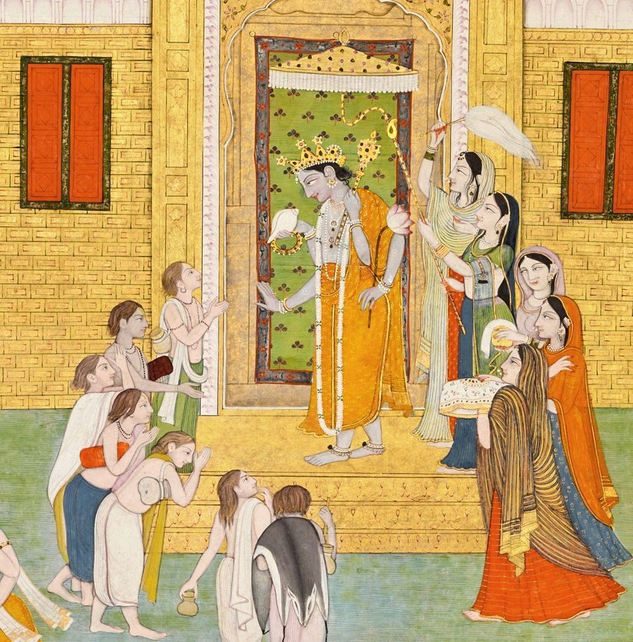 Conciencia de Krisna quiere decir teísmo pleno. Esto significa que podemos tener una relación con el Infinito, hasta el nivel de la relación conyugal. Todo lo que necesitamos para ayudarnos y conducirnos en la dirección correcta en realidad ha de encontrarse en el mundo espiritual en su posición más pura y deseable. Lo que encontramos aquí es una sombra, una oscura imitación. Pero ‘realidad’ quiere decir teísmo pleno, conciencia de Krishna, en donde el Infinito abraza al finito. El Infinito desciende para dar la bienvenida, para abrazar plenamente al finito, eso es Vrindavan. Y teísmo pleno es: Que a través de la conciencia de Krishna, una parte despreciable del finito puede experimentar el bienaventurado abrazo del Infinito. Y en Vrindavan, ningún recodo es despreciado. Allí, cada grano de arena, cada brizna de hierba, está bien representada con personalidad. Aquí hay tantas cosas que son insignificantes, qué decir de una partícula de arena. Sin embargo, en Vrindavan todo recibe atención. Nada es ignorado. Eso es teísmo pleno, como se explica en el Śṛīmad-Bhāgavatam (10.21.5):