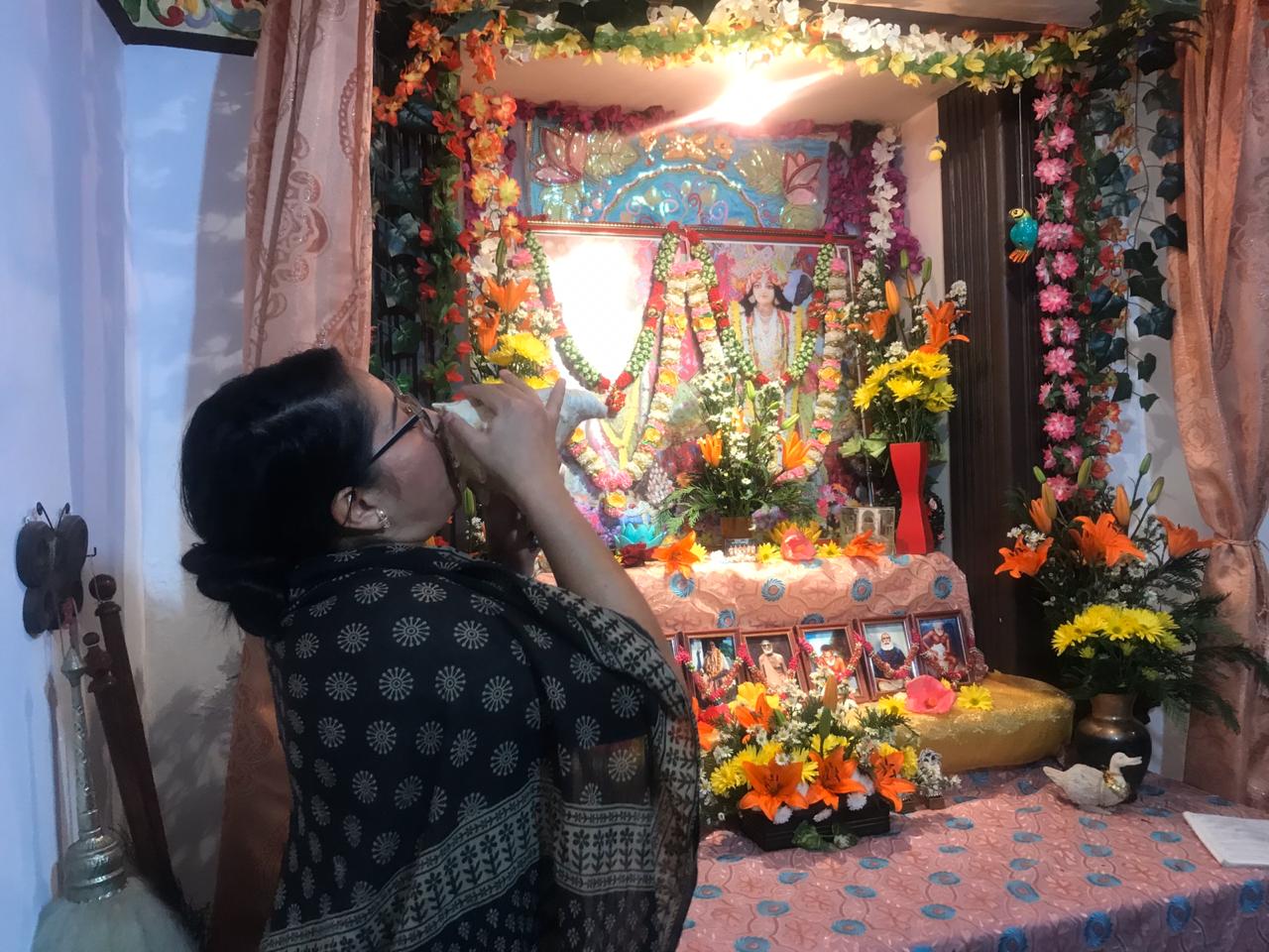 Conciencia de Krisna quiere decir teísmo pleno. Esto significa que podemos tener una relación con el Infinito, hasta el nivel de la relación conyugal. Todo lo que necesitamos para ayudarnos y conducirnos en la dirección correcta en realidad ha de encontrarse en el mundo espiritual en su posición más pura y deseable. Lo que encontramos aquí es una sombra, una oscura imitación. Pero ‘realidad’ quiere decir teísmo pleno, conciencia de Krishna, en donde el Infinito abraza al finito. El Infinito desciende para dar la bienvenida, para abrazar plenamente al finito, eso es Vrindavan. Y teísmo pleno es: Que a través de la conciencia de Krishna, una parte despreciable del finito puede experimentar el bienaventurado abrazo del Infinito. Y en Vrindavan, ningún recodo es despreciado. Allí, cada grano de arena, cada brizna de hierba, está bien representada con personalidad. Aquí hay tantas cosas que son insignificantes, qué decir de una partícula de arena. Sin embargo, en Vrindavan todo recibe atención. Nada es ignorado. Eso es teísmo pleno, como se explica en el Śṛīmad-Bhāgavatam (10.21.5):