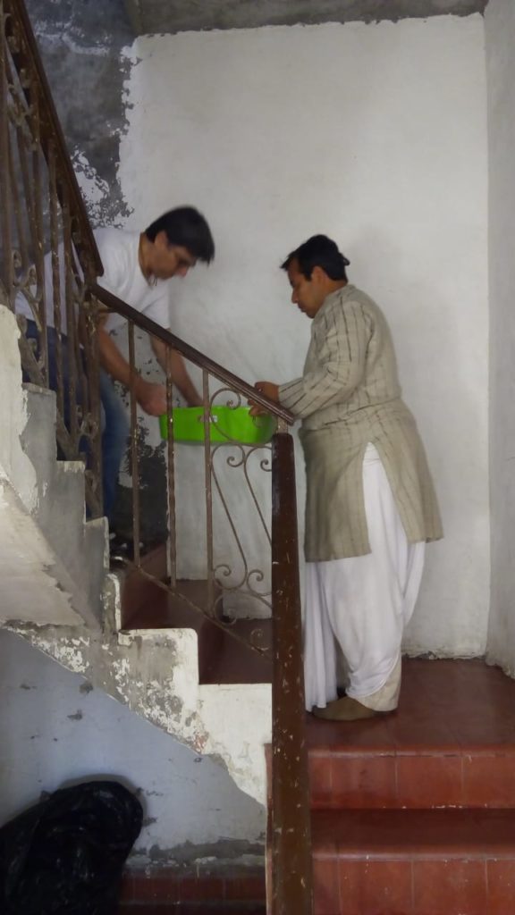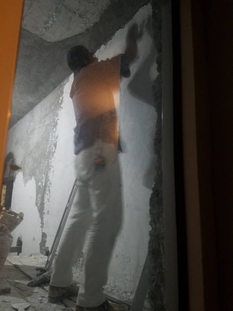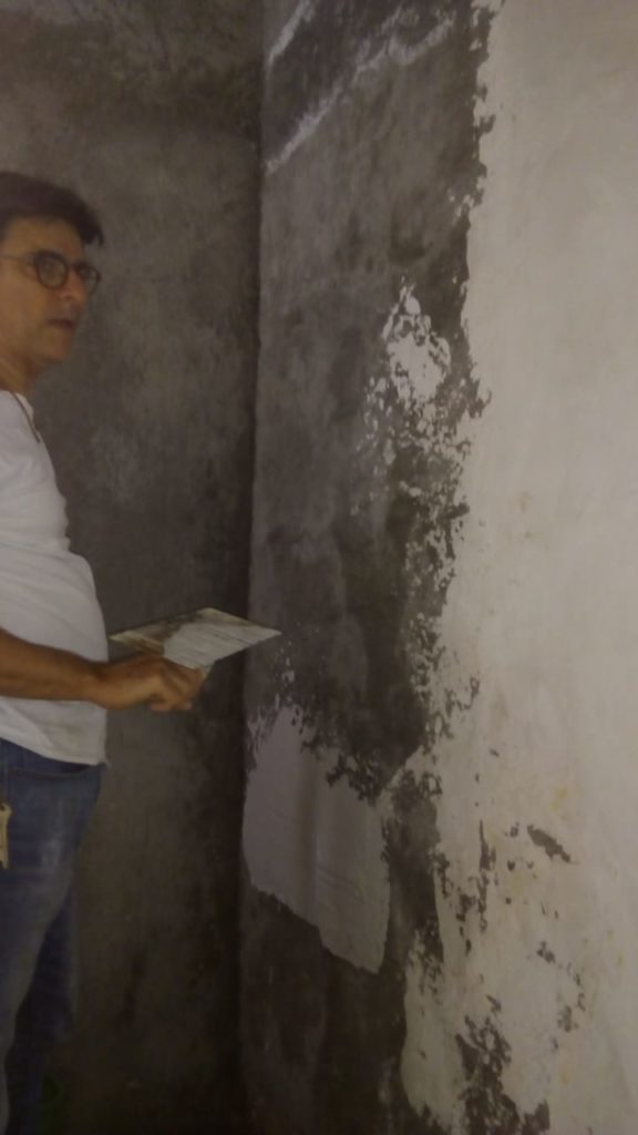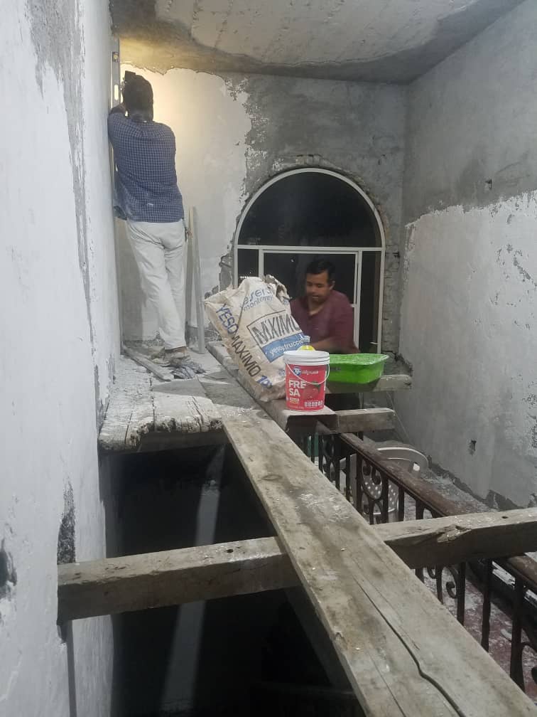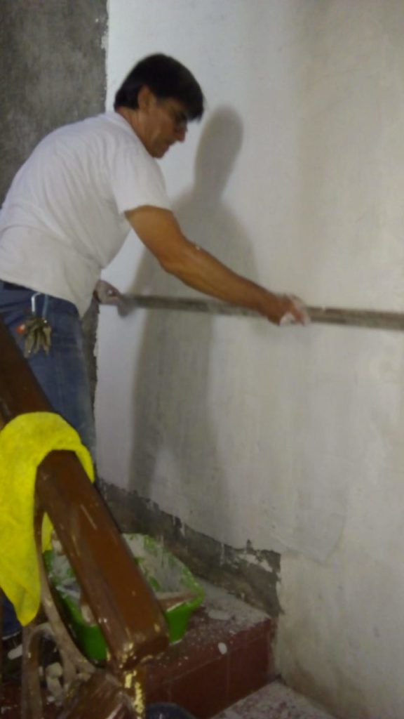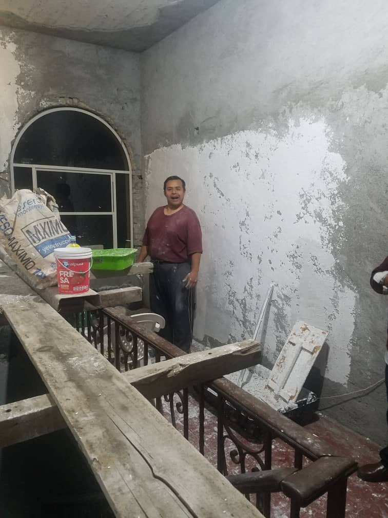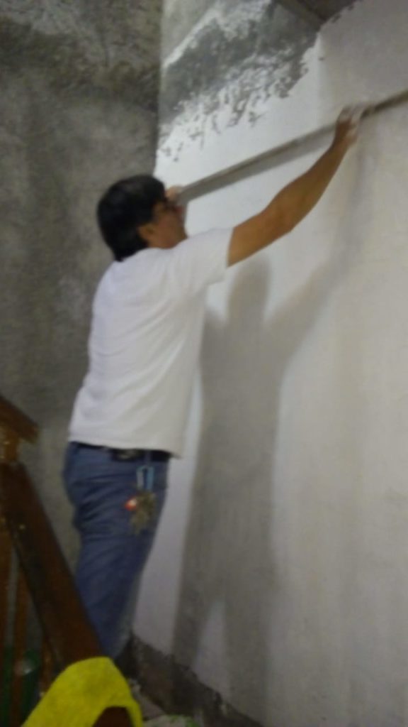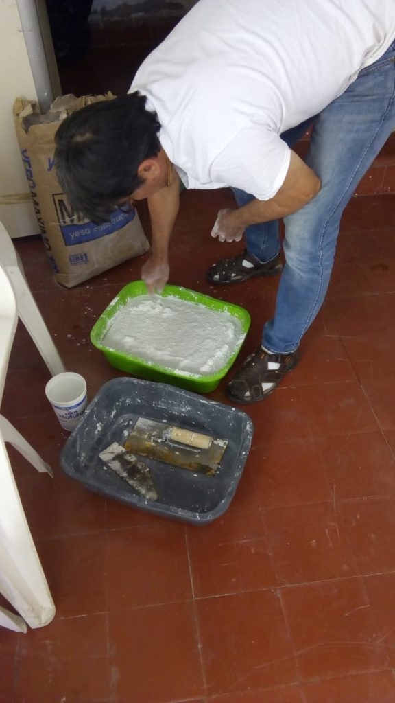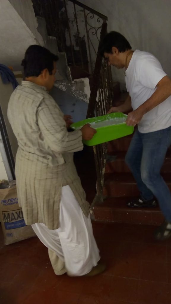 Arjuna prabhu y Radha Krishna prabhu, preparando la mezcla para “el revocado”, o la aplicación de yeso en las paredes en la entrada, planta baja del Ashram en Monterrey N.L