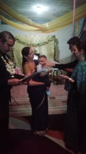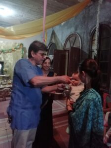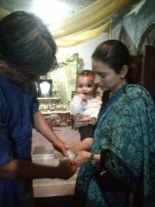La protección del bebé: En seguida se procedió a invocar la protección del bebé tal como lo hicieron las gopis tras ver que la muerte de la bruja Putana. Mientras Syama Nalini devi dasi sostenía al bebé, Nava Kishori devi dasi untaba tilak mientras los asistentes repetían al unisono cada frase del mantra y cada parte del cuerpo a proteger.
