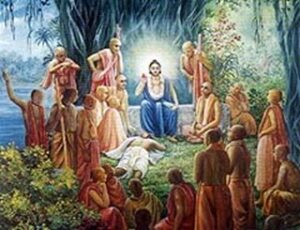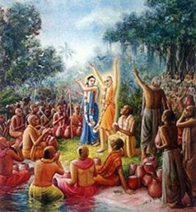 Él le ordenó a la multitud de devotos: «Todos ustedes coman, cantando el Santo Nombre de ‘Hari’». De inmediato, resonaron los Santos Nombres «Hari, Hari», llenando el universo entero. Mientras todos los Vaisnavas cantaban los Nombres del Señor y tomaban prasadam, ellos recordaron cómo Krisna y Balaram comieron con Sus compañeros en la ribera del Yamuna. «Como el verticilo de una flor de loto rodeado por sus pétalos y hojas, Krisna se sentó en el centro, circundado por hileras de amigos Suyos, quienes lucían todos muy hermosos. Cada uno de ellos trataba de mirar a Krisna, pensando que Krisna le podía mirar a él. De esa manera ellos disfrutaban su almuerzo en el bosque». (Bhagavatam 10.13.8) Los devotos confidenciales del Señor que eran pastorcillos de vacas en verdad sintieron que la ribera del Ganga era ahora la ribera del Yamuna. Sri Raghunath Das observó todas estas actividades y sintió que su corazón rebosaba de la misericordia gentil y liberal de Sri Sri Nitai Chaitanyadev.