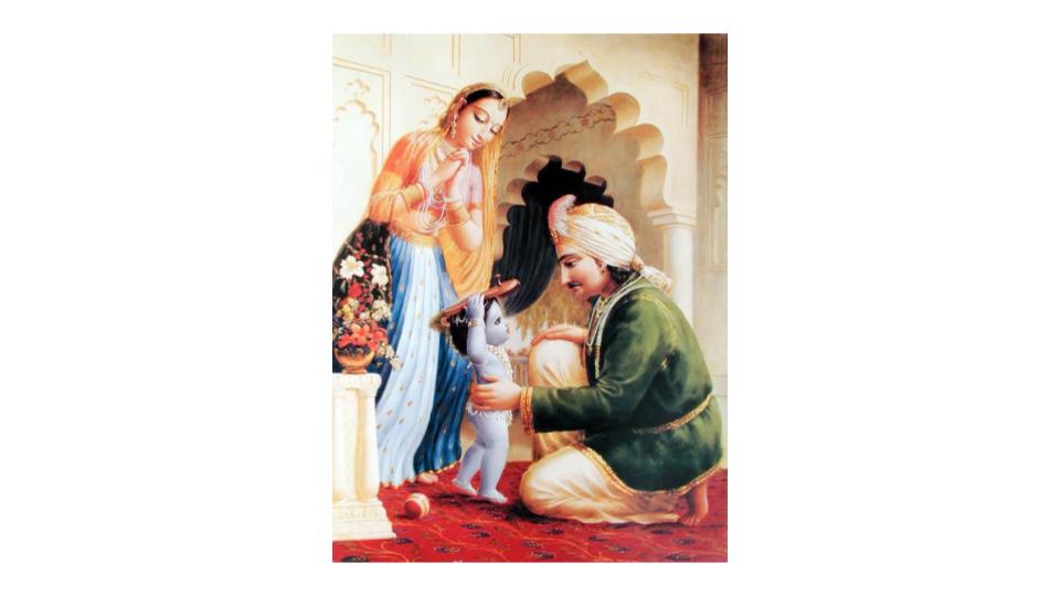 «Después de tanto tiempo Maharaj Nanda ha tenido un hijo. Y es increíblemente hermoso». Al escuchar esto, todos los Vraja-vasis llegaron con ingredientes como leche, queso, gui, mantequilla, algunos ornamentos, flores y otros diversos artículos, para ofrecerlos como regalos. Ellos llegaron a la casa de Maharaj Nanda con todas estas cosas. Y la tradición de ellos es bailar y cantar. De modo que bailaron, cantaron y se arrojaron mantequilla, queso y otros artículos con un humor embriagado. Hemos visto en las aldeas de Bengala que todavía la gente celebra festivales de esta manera. El sacerdote de Maharaj Nanda, el muy famoso Garga Muni, también llegó para el festival y le dio el Nombre “Krisna” al hijo de Maharaj Nanda. Desde ese día el hijo de Maharaj Nanda se volvió muy famoso y Garga Muni le dijo a todos que el niño tenía el poder para ser el controlador de todo el universo. Garga Muni no dijo que el hijo de Maharaj Nanda era el Señor Supremo, pero vio y sintió que Él lo era y consideró que todos los demás verían Sus Pasatiempos en el futuro.
