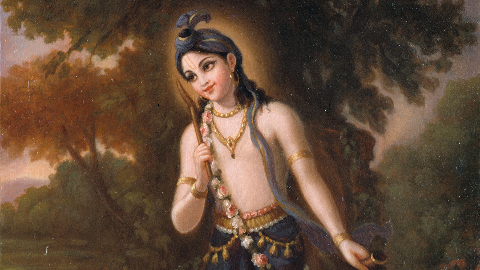 Mientras Krisna y Balaram alababan la belleza del anochecer, aparecieron la luna y las estrellas. La fragancia del jazmín de Arabia embriagó a los abejorros y una ligera brisa llevó los aromas de los lirios blancos y las flores de loto.