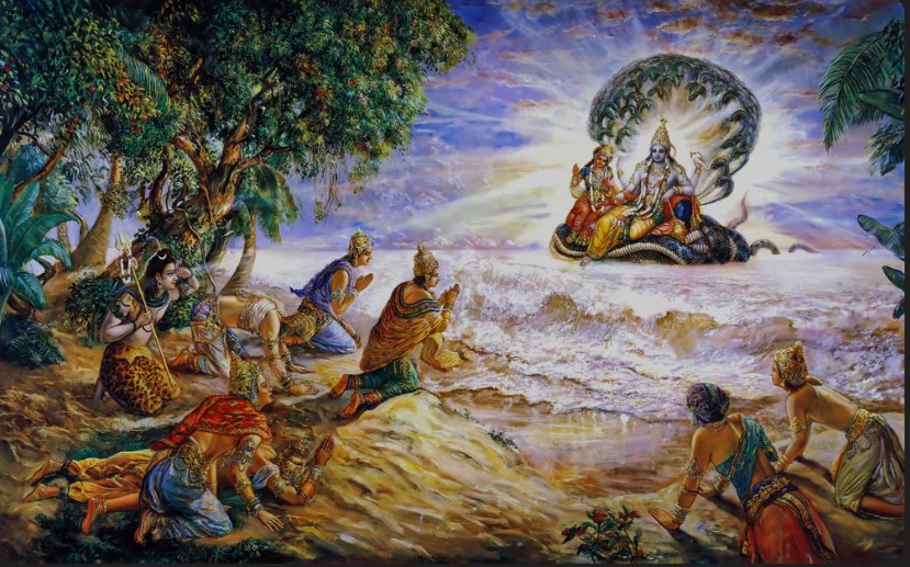 Una vez, el mundo se vio agobiado por la innecesaria fuerza defensiva de varios reyes, que se hacían pasar por miembros de la orden real, pero que en realidad eran demonios. En ese entonces, el mundo entero estaba perturbado, y la deidad predominante de la Tierra, conocida como Bhūmi, fue a ver al Señor Brahmā para contarle acerca de las calamidades que le causaban esos reyes demoníacos. Bhūmi asumió la forma de una vaca y se presentó ante el Señor Brahmā con lágrimas en sus ojos. Ella estaba desolada, y lloraba simplemente para invocar la compasión del Señor. Bhūmi le describió al Señor Brahmā la desastrosa situación en la que se hallaba la Tierra, y Brahmā, después de oír esto, se afligió mucho y se dirigió de inmediato hacia el océano de leche, donde reside el Señor Viṣṇu. El Señor Brahmā iba acompañado por todos los semidioses, encabezados por el Señor Śiva, y Bhūmi también los acompañó.