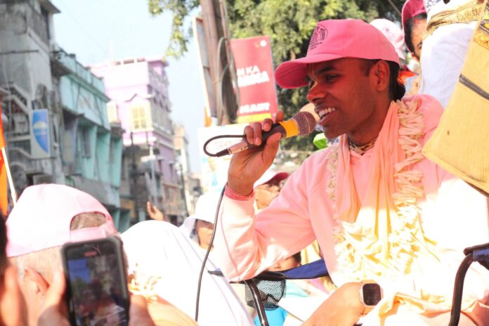Debes ocupar a tus familiares y amigos en el servicio a Krishna, Tenemos apego por ellos, debemos también desarrollar apego por los devotos. Cuando obtenemos el conocimiento verdadero, podemos desarrollar que Vasudev está en todas partes. Familiares, amigos, todos ellos son devotos de Krishna pero lo han olvidado, entonces debes ocuparlos en el servicio a Krishna, de esa manera no pensarás que cuando estas con ellos estás lejos de la asociación. Mahaprabhu decía, no importa si estamos dentro de la vida familiar, igualmente podemos ocuparnos en el servicio a Krishna. No mostrar externamente que somos devotos. Si, puedes estar ocupado en la vida familiar, pero no apegarte a ellos. Gurudev (Srila Bhakti Nirmal Acharya Maharaj) decía: nuestra concepción no es abandonarlo todo e irnos a meditar al bosque. Nuestra concepción implica ocuparnos en el canto congregacional, en el sankirtan. Cuando estamos cantando el kirtan hay un extracto en la letra que dice “ghosta vihari”. Esto significa en multitud, no en solitario. Mahaprabhu instruye: “Ve y conviértete en guru, yo te respaldaré”. Entonces si seguimos la instrucción de Mahaprabhu, Él está detrás de nosotros. Nos está apoyando